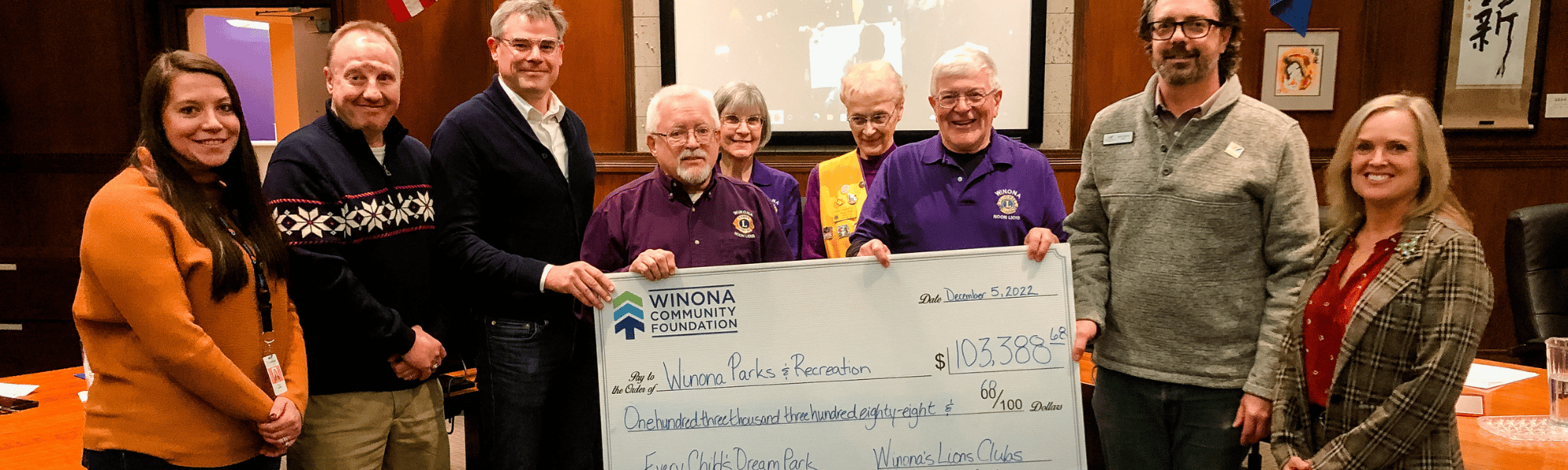 On December 1, 2022, the Winona Noon Lions Club, Winona Rivertown, Winona Sunset, and the Celanese Community Foundation accomplished their Phase 2 fundraising goal for the Every Child’s Dream Park Fund, which supports an ability-inclusive playground. The Winona Lion’s Club raised $103,388.68 to donate to the City of Winona for this special project. The Winona Community Foundation served as the fiscal sponsor for this special project.